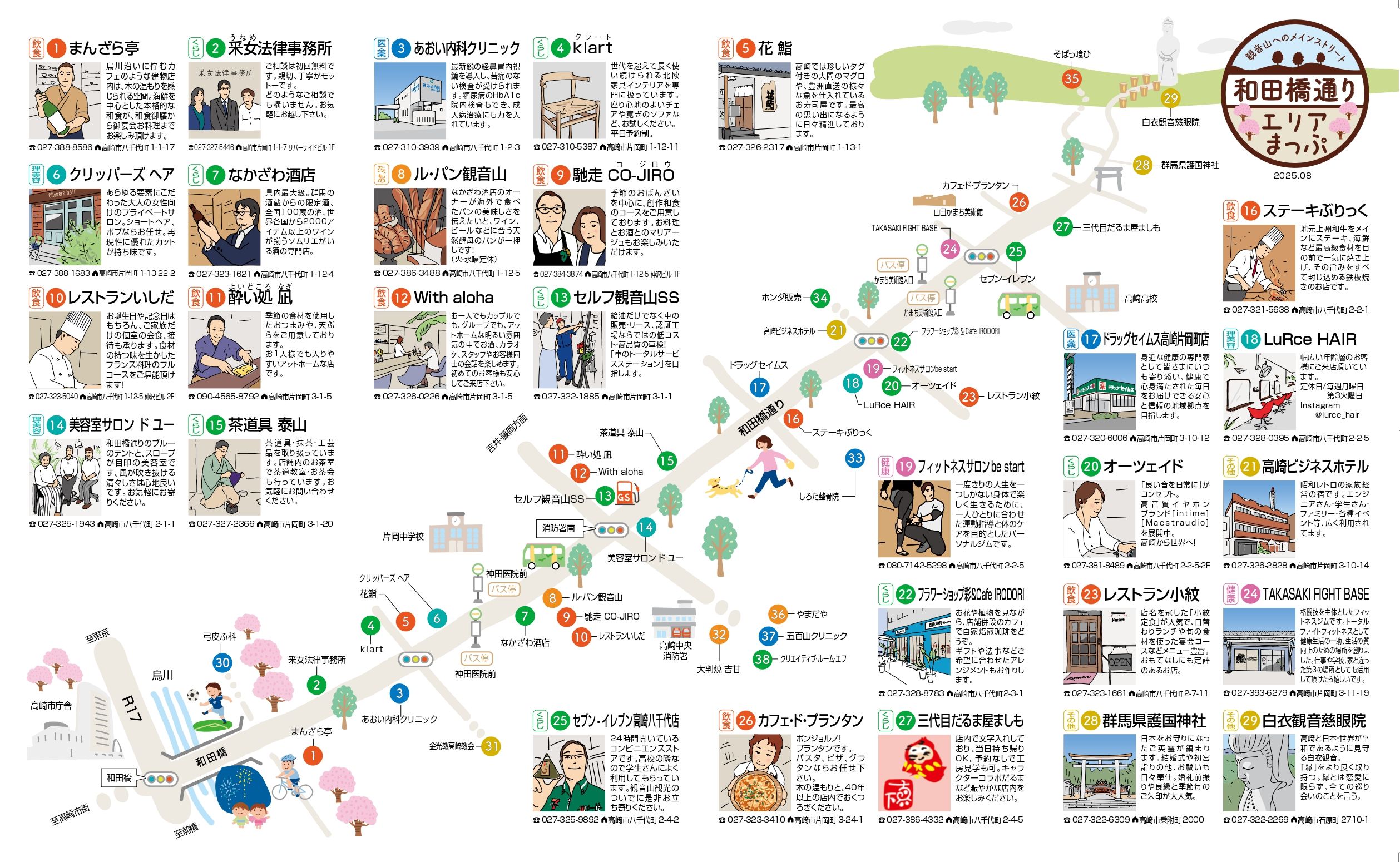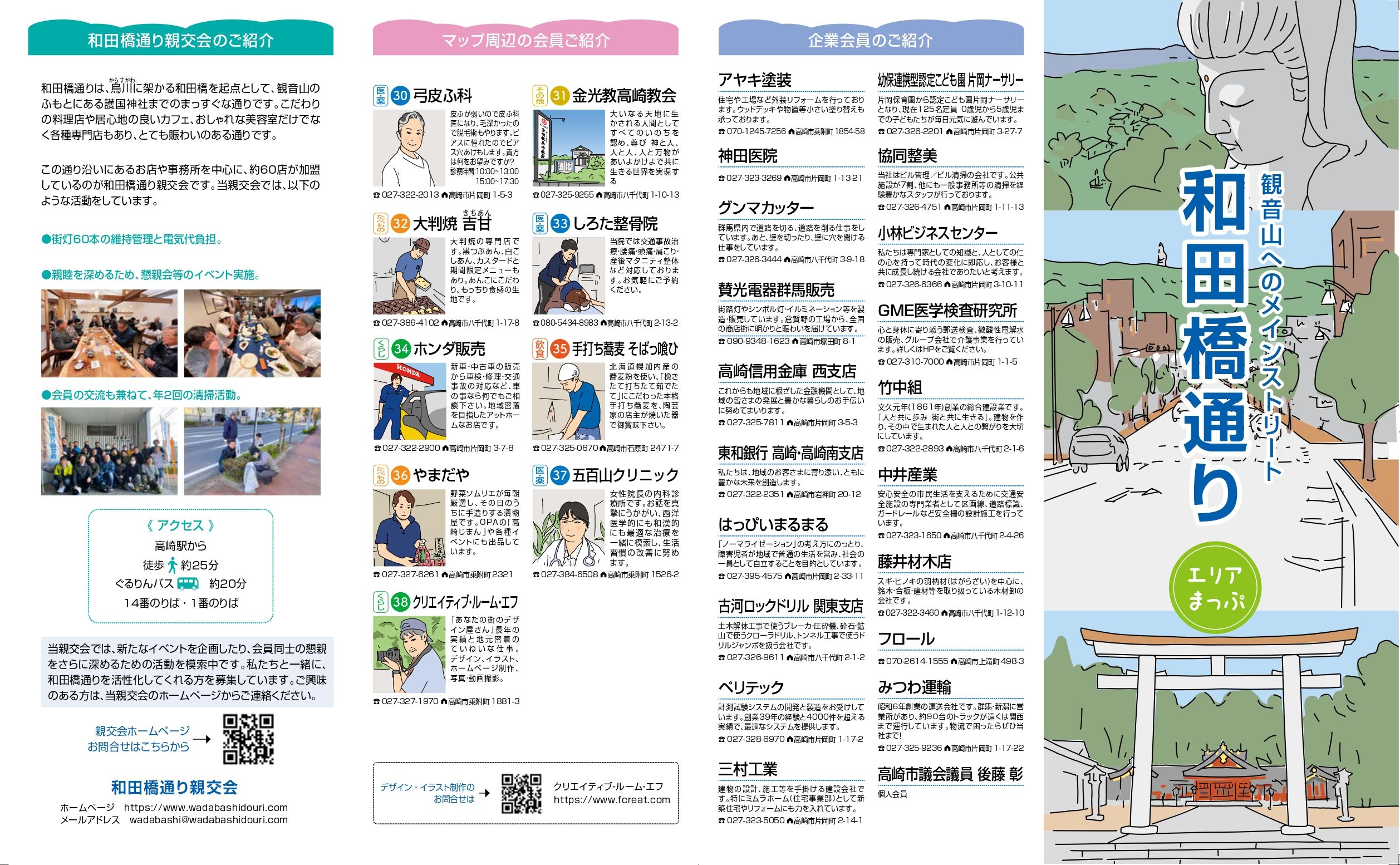 親交会に加入しているお店・会社を紹介するため、通りのマップを作成しました。 和田橋から護国神社までの通り沿いをメインとして、イラストで各店を紹介しています。各店が、自己紹介する形で魅力をアピールしておりますので、是非ご覧ください! 紙のマップは、会員店舗でお配りしています。 (下記画像をクリックすると拡大表示されます) デザインは、会員のクリエイティブ・ルーム・エフさんにお願いしました。